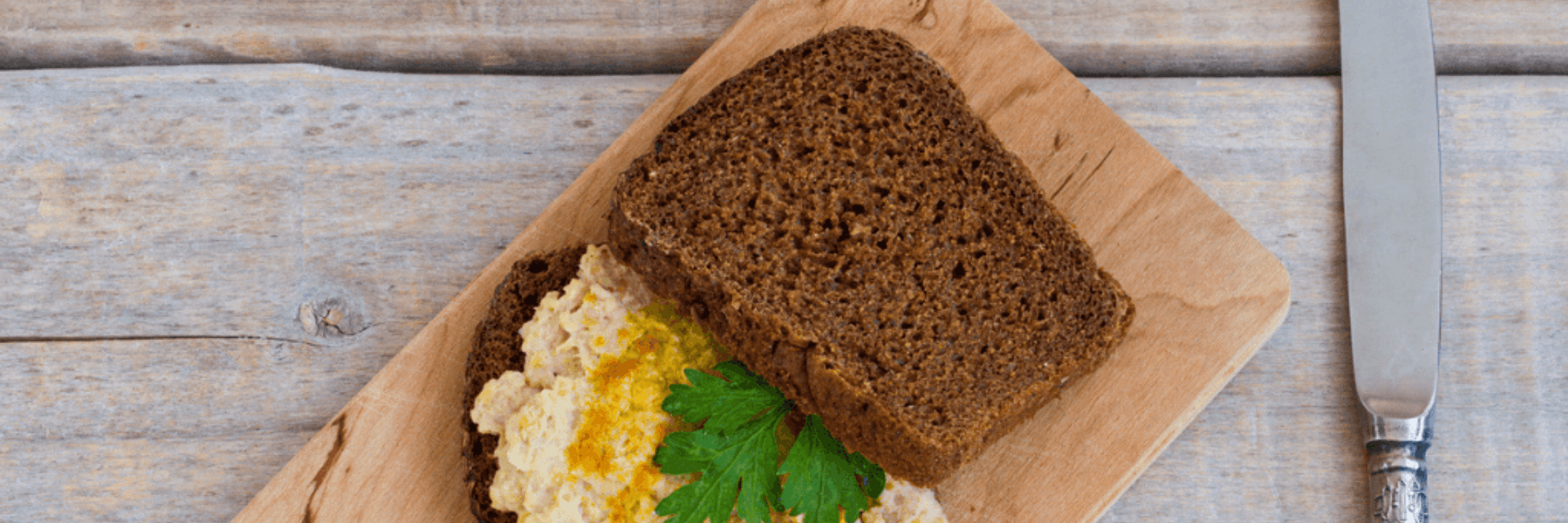 High-fibre rye bread topped with creamy chickpeas and a hint of tahini, a quick, nourishing snack or light lunch.
