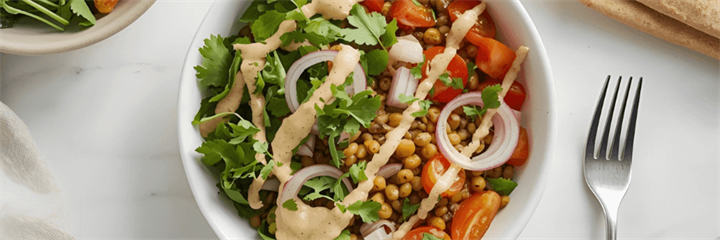 A vibrant, nutritious bowl packed with lentils, brown rice, fresh herbs and a creamy tahini dressing. Perfect for a satisfying lunch or light dinner.
