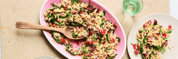 A fresh, Mediterranean-inspired tuna salad with roasted peppers, sun-dried tomatoes, and dill, tossed with orzo for a quick and satisfying meal.