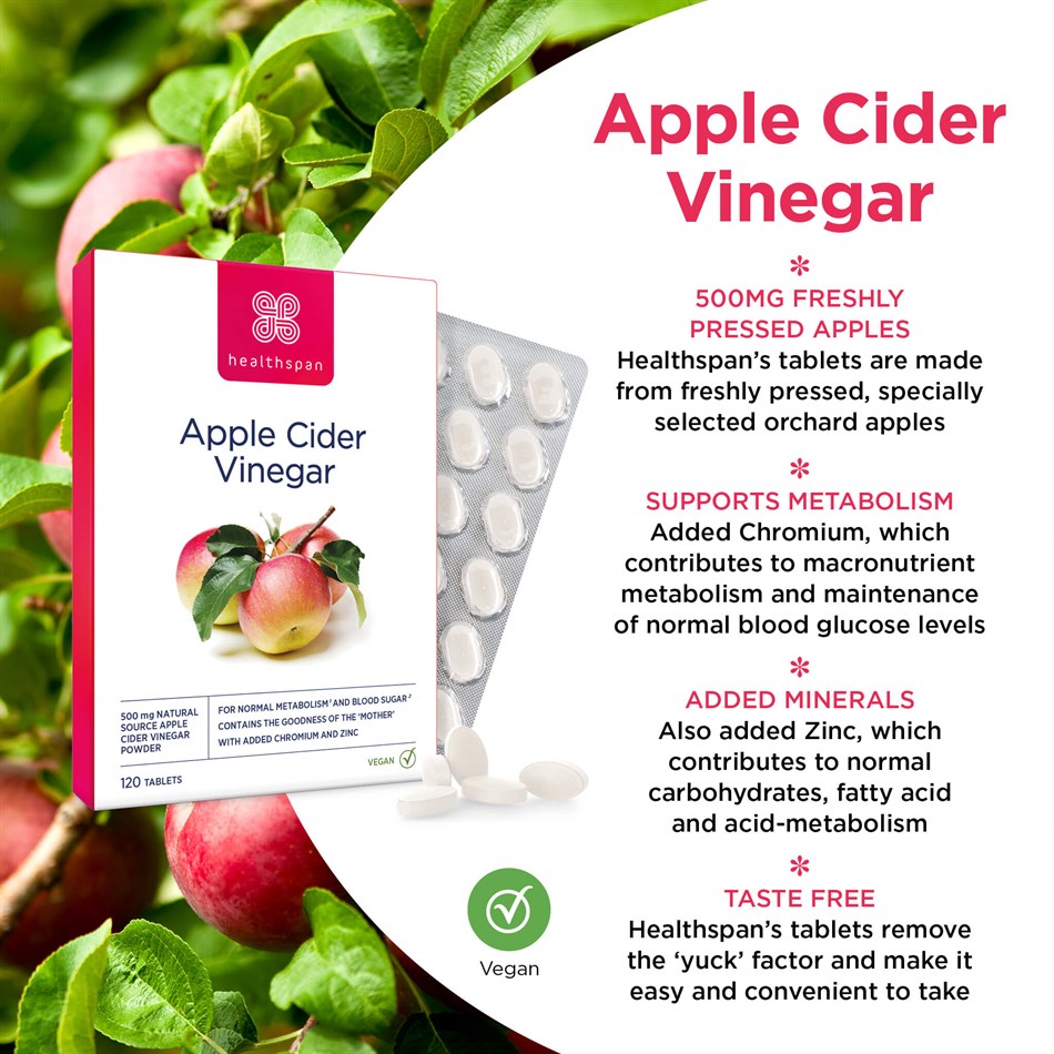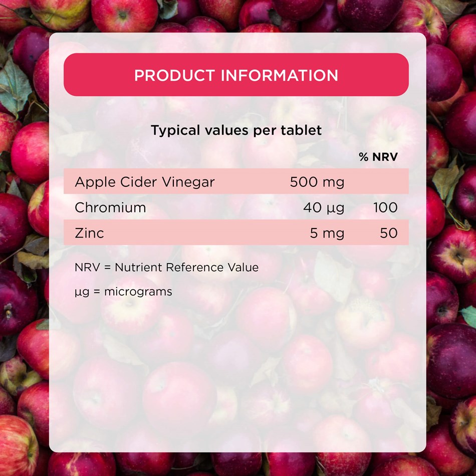 - 500 mg apple cider vinegar tablets, extracted from UK orchard apples