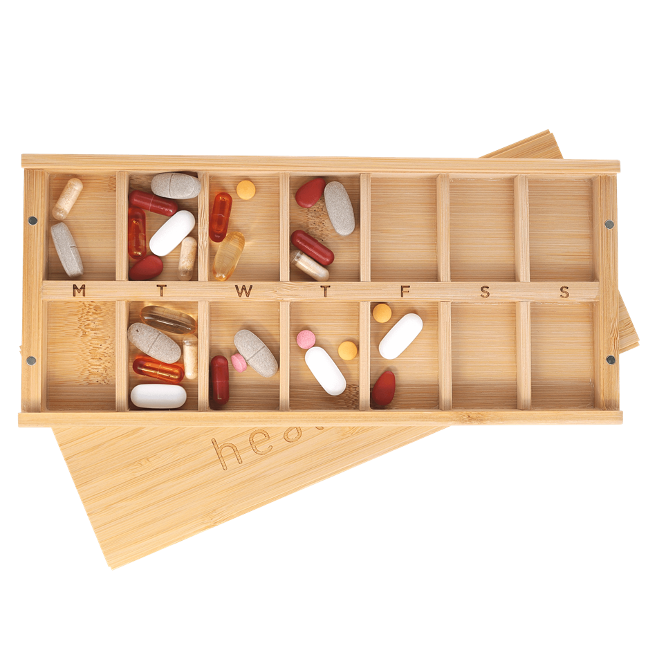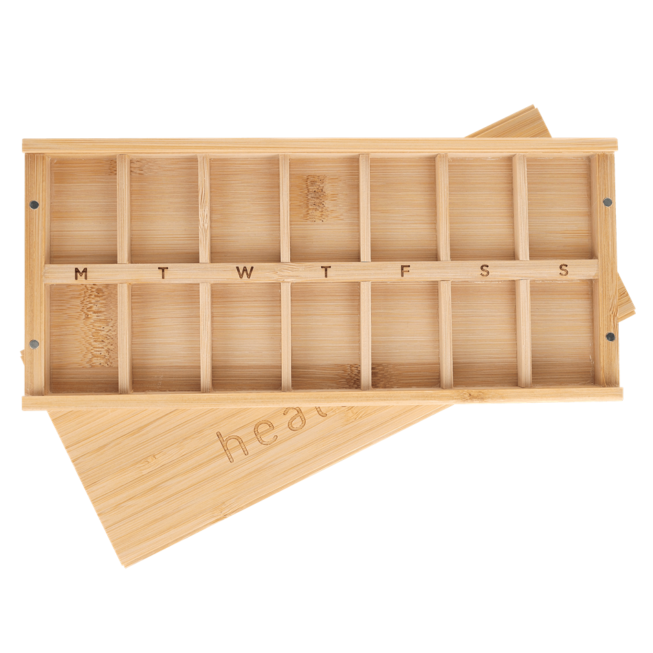 A simple way to bring structure to your supplement routine. This beautiful organiser crafted from natural bamboo features 14 clearly marked compartments, allowing you to plan your supplements by day and time - morning and evening - so nothing gets missed. Taking supplements consistently is essential to maximise their effectiveness. Missed doses or irregular use can limit the benefits, whereas a structured routine helps you get the most from your Healthspan supplements. The smooth sliding lid keeps everything neatly stored, whether it’s on your bedside table or in your travel bag.