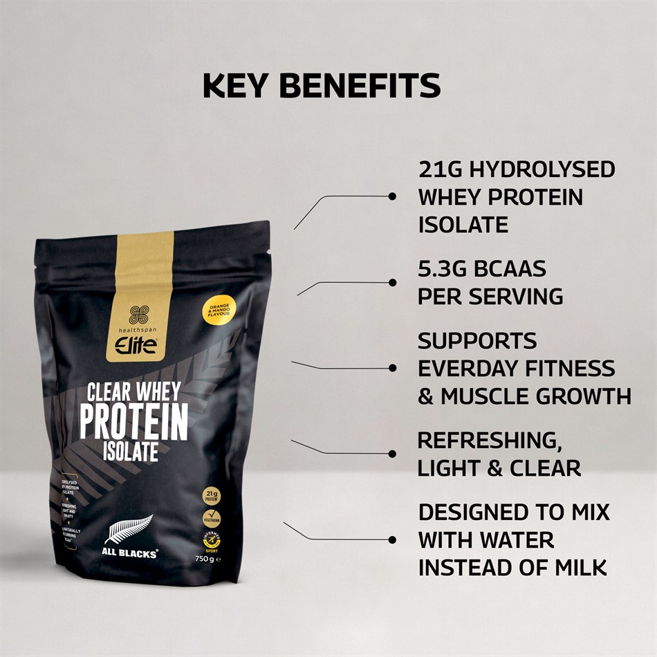 As we age, a loss in muscle mass can affect strength & mobility. If you’re looking for a high-protein option that’s easier to digest and lighter than traditional shakes, Elite All Blacks Clear Whey Protein Isolate is the perfect choice. Designed to be mixed with water, this refreshing, juice-like protein drink delivers 21g of hydrolysed whey protein isolate per serving, plus 5.3g of naturally occurring BCAAs to support muscle maintenance and recovery without the heaviness of milky shakes.