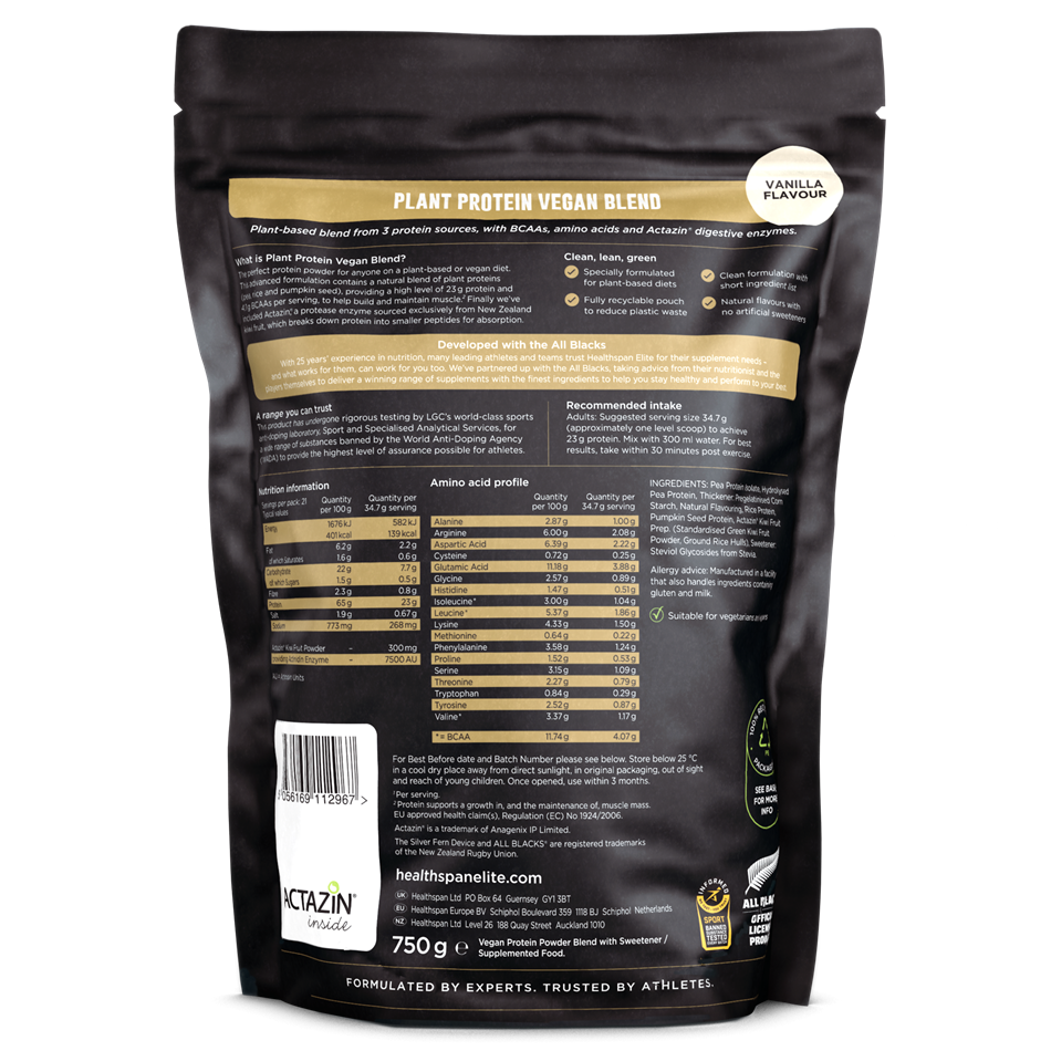 As we age, muscle maintenance becomes increasingly important to support strength, mobility, and overall well-being. Whether you're following a plant-based diet or simply looking for a high-quality, dairy-free protein, Elite All Blacks Plant Protein Vegan Blend delivers 24g of protein from a premium mix of pea, pumpkin, and brown rice proteins, plus 4.1g of naturally occurring BCAAs to help prevent muscle loss and aid recovery. We’ve also added Actazin, a protease enzyme sourced from New Zealand kiwi fruit, which breaks down protein into smaller peptides for better absorption in the body. With a luxurious natural vanilla flavour, our Plant Protein Vegan Blend tastes great and is easy to mix. It’s also low in sugar and contains no artificial sweeteners – we use Stevia, a natural alternative.