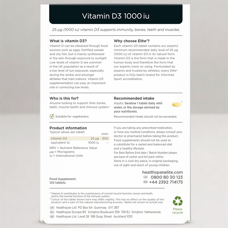 Each vitamin D3 tablet contains our experts' recommended level of 25µg (1000iu) of vitamin D3 in its natural form. Vitamin D3 is the form that is made in the human body and therefore the form that our experts insist on using. The result of the extraction and purification process used results in a highly concentrated form of vitamin D3 which offers 99% purity and unparalleled quality.