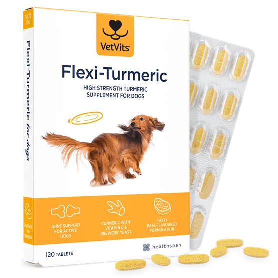 Flexi-Turmeric is a high-strength supplement made with turmeric root extract, rich in naturally occurring curcuminoids. It’s designed to support your dog’s joint health, mobility, and general wellbeing, especially as they age or stay active. Each tablet of Flexi−Turmeric has 400 mg of high−grade turmeric extracted from turmeric root powder. We’ve also added stomach−friendly vitamin C to support immunity and joint health and brewers' yeast for a tasty beef flavour that your dog will love. Our tablets are easy-to-use, just crumble them over your dogs food for a nutritious addition to their meal that you can feel good about.