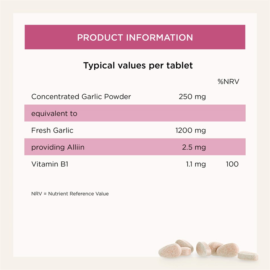 It is a heart health recipe created by our experts, containing ingredients your heart loves.* Our experts mixed a concentrated dose of garlic powder with vitamin B1 to support your cardiac function, and created smooth coated tablets to make them easy to swallow. Each tablet contains 250 mg of concentrated garlic powder, equivalent of 1200 mg of fresh garlic.