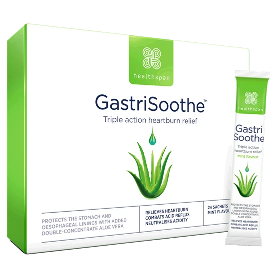 GastriSoothe™ is the UK’s first triple−action heartburn solution combined with the natural power of aloe vera. It acts fast and provides long lasting relief from the pain and discomfort of heartburn. The triple−action formula fights acid reflux, neutralises acidity and protects the gastric lining.