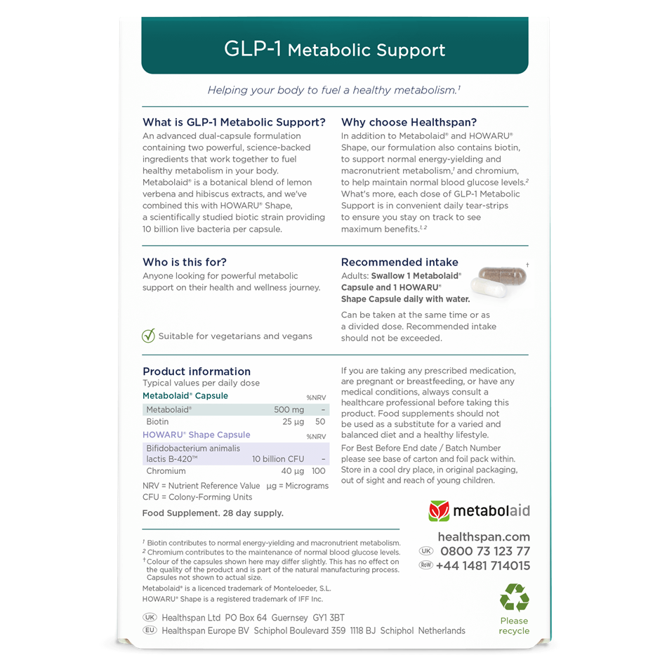 Our solution to supporting GLP-1 levels contains two powerful ingredients, including Metabolaid®, a scientifically researched botanical blend of Lemon verbena and Hibiscus extracts that has been shown to significantly increase GLP-1 levels. We’ve also included 10 billion HOWARU® Shape probiotics, providing 10 billion live bacteria per capsule and shown to support the growth of Akkermansia muciniphila, a beneficial gut bacterium linked with lean body mass and improved fat metabolism. Participants experienced a 56% reduction in hunger in just 15 days, with results increasing to an 85% reduction over 60 days. Together, these two powerful capsules offer an effective approach to appetite regulation and metabolic health.