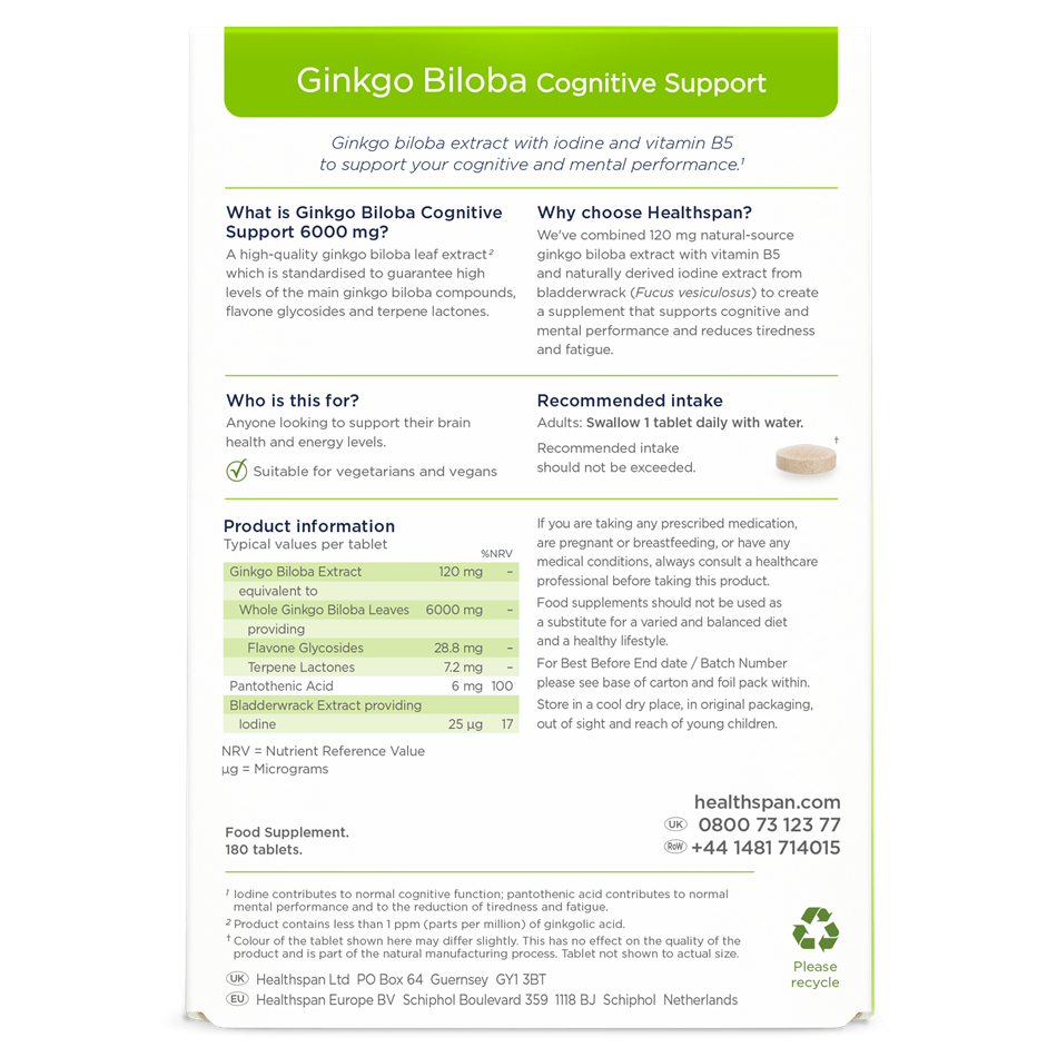 We use a standardised extraction process, which guarantees that each tablet contains 120 mg extract rich in flavone glycosides - equivalent to 6000 mg ginkgo biloba leaves. What’s more, this high quality extract contains less than 1ppm (parts per million) of ginkgolic acid. We also add iodine, which is involved in cognitive function, as well as vitamin B5, known as pantothenic acid, which contributes to mental performance and helps combat tiredness and fatigue.