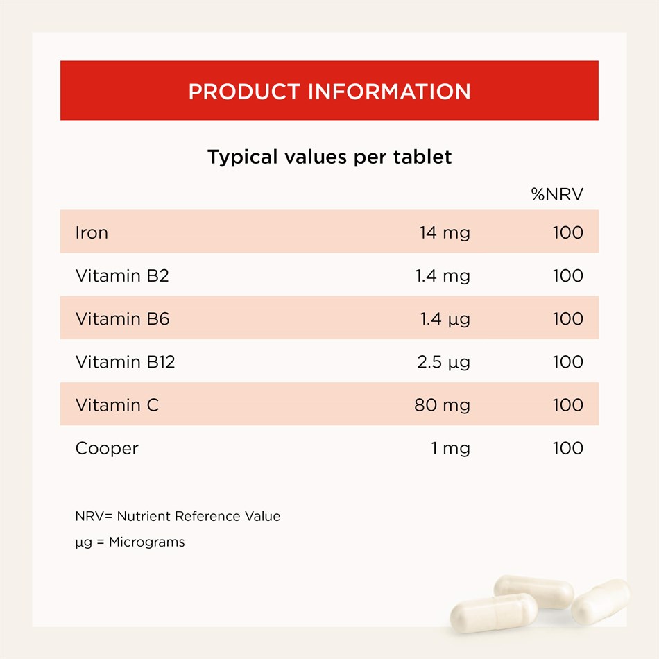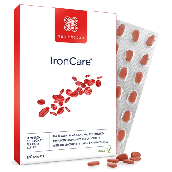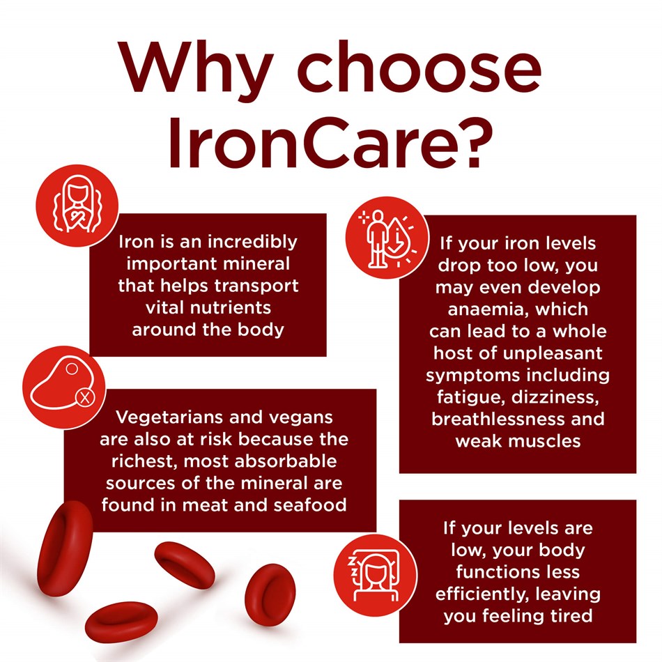 IronCare® contributes to the formation of red blood cells and haemoglobin. It contains vitamin B2, which supports the body's ability to metabolise iron, along with B6, which is important for energy and combating fatigue. It also includes copper, which helps transport iron around the body, as well as vitamin C, which helps in the absorption of iron. Even better, our iron tablets are suitable for vegetarians and vegans; this is especially important to help reduce the risk of deficiencies in anyone following a meat−free diet. This tablet has been designed for easy swallowing and, last but not least, it is made from iron bisglycinate, which is gentle on the stomach, preventing some of the side effects associated with traditional iron supplements, such as constipation and nausea.