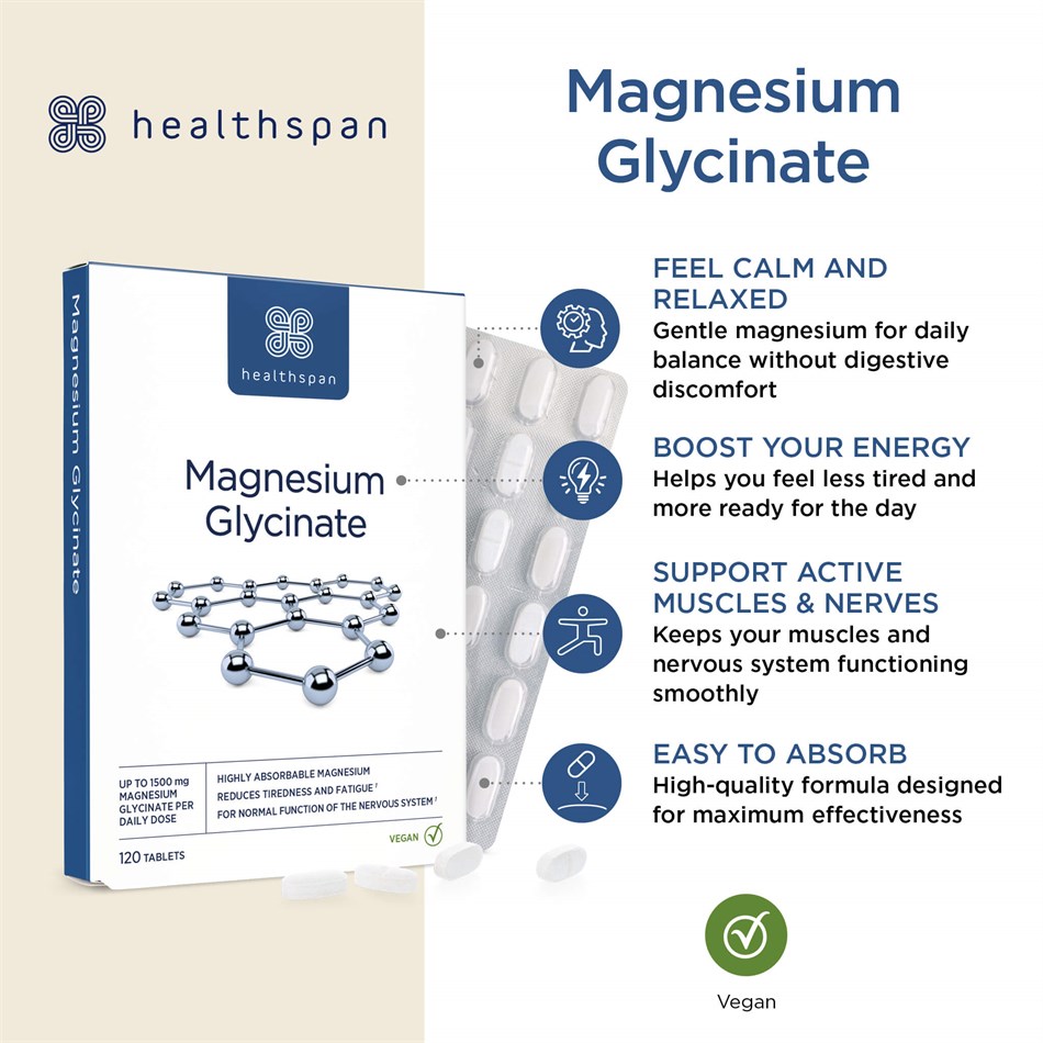 Magnesium is an essential mineral that plays a key role in many bodily functions, from supporting muscle function to reducing tiredness and fatigue. According to the latest UK’s National Diet and Nutrition Survey, many of us aren’t getting enough magnesium from our diets. Magnesium glycinate is a form of magnesium that has been bound with the amino acid, glycine. This makes it more easily absorbed by the body, making it a preferred choice for those looking to support their magnesium levels. Unlike some other forms, magnesium glycinate is well tolerated and less likely to cause digestive discomfort.