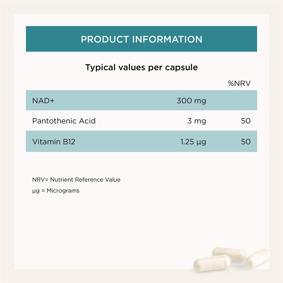Each capsule provides 300 mg pure NAD+ ready for your cells to use, with no conversion steps required. Delayed release technology ensures that the NAD+ reaches your lower gut before being broken down and absorbed by the body. What’s more, pantothenic acid and vitamin B12 have been added to further support normal energy-yielding metabolism, psychological function and the reduction of tiredness and fatigue.1 2