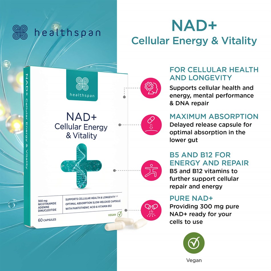 NAD+, or Nicotinamide adenine dinucleotide, is a vital coenzyme found in all living cells. It plays a crucial role in various cellular processes, particularly energy metabolism & DNA repair. As we age, NAD+ levels decline and low levels can result in decreased energy, slower cell repair, weakened immunity and accelerated ageing. While there are several precursors available that can be converted to produce NAD+, this formulation directly delivers pure and bioactive NAD+ for your body to use right away.