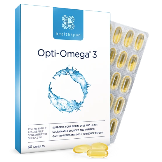 Omega 3 fatty acids have a range of proven health benefits, and have long been recommended by health professionals and nutrition experts. DHA and EPA in particular are two fatty acids that can support your brain, eye and heart health in the right doses*. The UK's Food Standards Agency still recommends eating two portions of fish every week, but if you don't eat much fish, an omega 3 supplement is a great alternative to receive the benefits to your health. Unlike most other omega 3 supplements, Healthspan's Opti−Omega® 3 uses omega 3 in the body−ready triglyceride (TG) form, which is more easily absorbed with better bioavailability. Each capsule provides 320 mg EPA and 320 mg DHA.