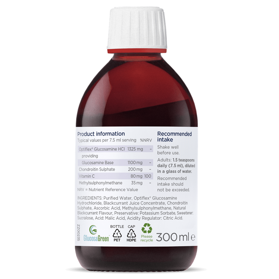 We combine the most popular supplements for cartilage health in a high−strength, tasty blackcurrant liquid formulation, specifically created for those who dislike swallowing tablets or capsules. We include our patented Optiflex® glucosamine − the first glucosamine to be made from corn, and therefore free from shellfish and associated allergens; the finest 90% grade chondroitin sulphate, as well as the purest form of MSM available. For extra power, we also add vitamin C, which plays a key role in collagen formation, needed for the normal function of cartilage and bones.