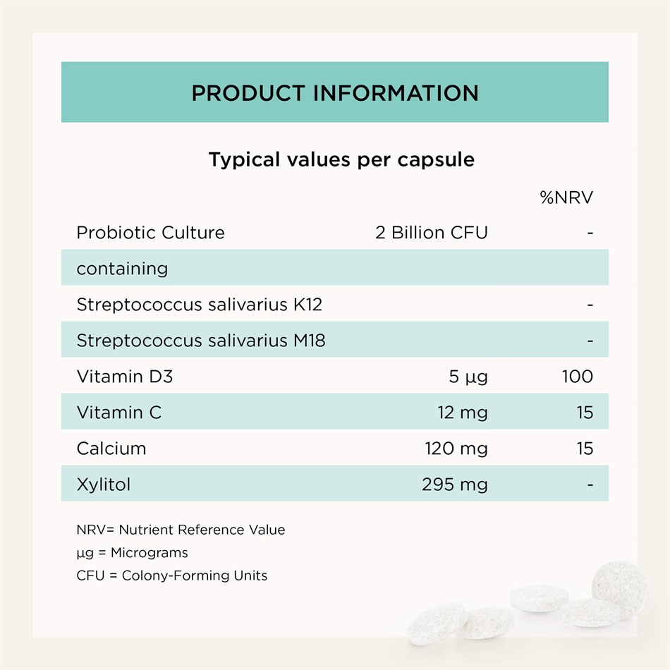 Each chewable tablet combines two clinically researched strains - BLIS K12™ and BLIS M18™ - to support a healthy oral microbiome by balancing good and bad bacteria in the mouth.
