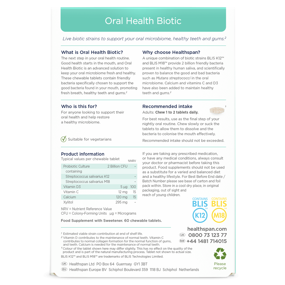 These tablets are chewable, sweetened with tooth-friendly xylitol, and flavoured with spearmint to further support fresh breath. For best results, take at night as the last step of your oral care routine, when saliva flow is lower and the beneficial bacteria can colonise more effectively. Oral Health Biotic perfectly complements daily brushing and flossing.