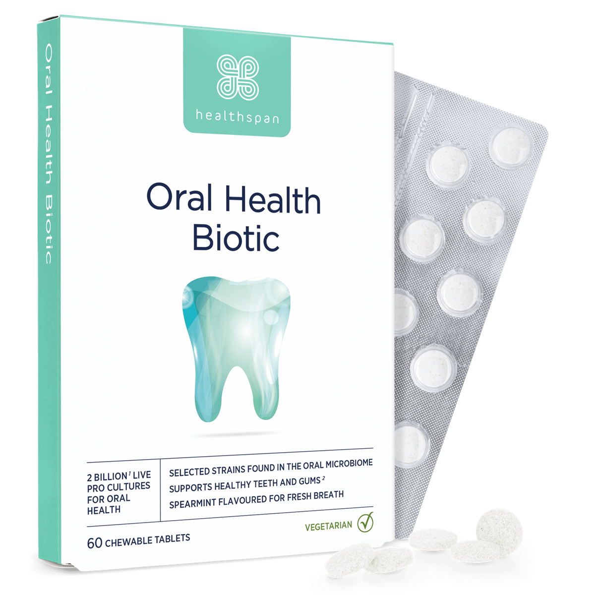 The next step in your oral health routine. Good health starts in the mouth, and Oral Health Biotic is an advanced solution to keep your oral microbiome fresh and healthy. These chewable tablets contain live probiotic strains specifically chosen to support the good bacteria found in your mouth, promoting fresh breath, healthy teeth and gums.
