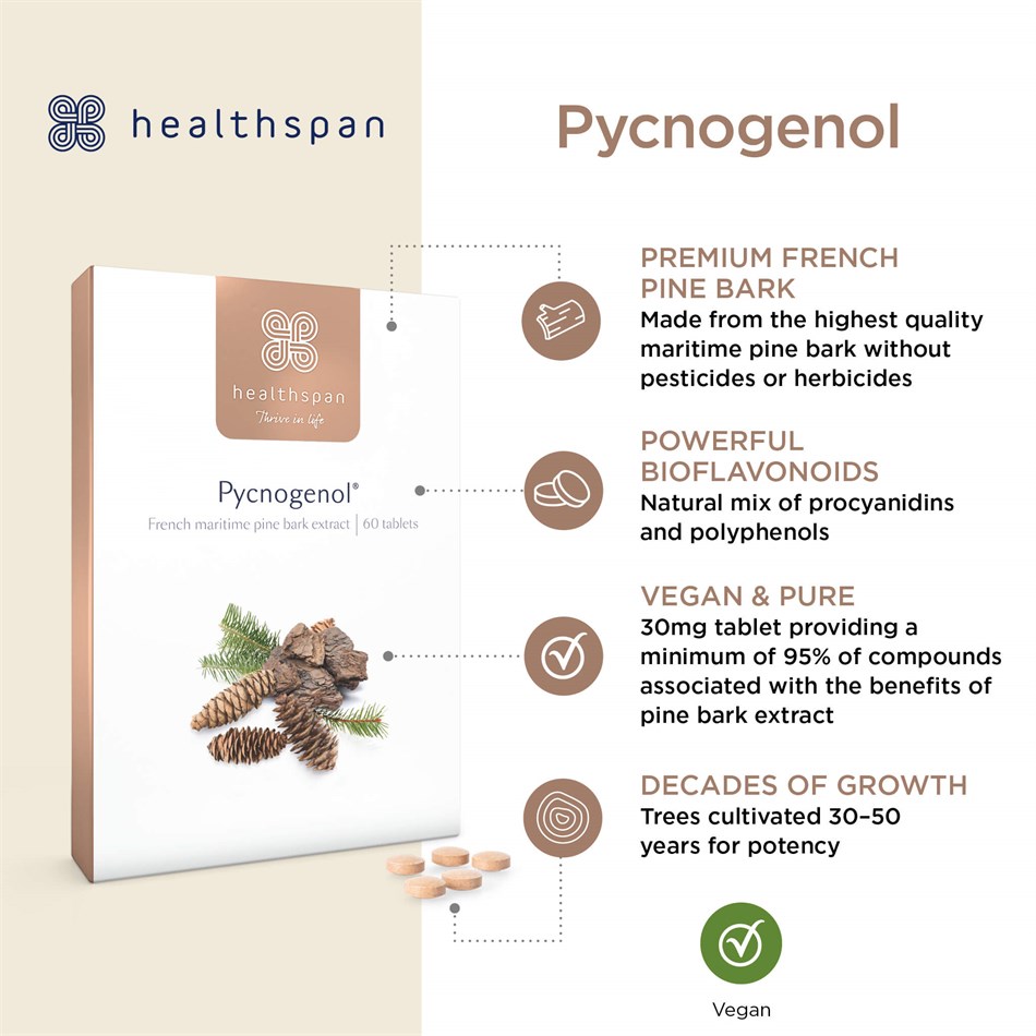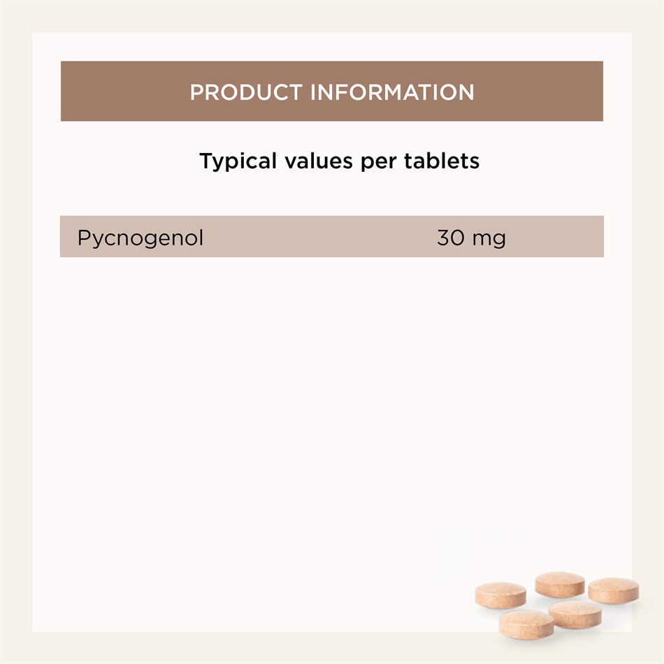 All pine bark extracts and pine bark supplements are not the same Pycnogenol® is manufactured from only the very highest quality natural extract of French maritime pine bark, from trees that are cultivated over a period of thirty to fifty years with absolutely no pesticides or herbicides. Each vegan 30 mg tablet provides a minimum of 95 % of compounds associated with the benefits of pine bark extract, including procyanidins, phenolic acids, bioflavonoids and polyphenols, such as taxifolin, ferulic acid and catechin.
