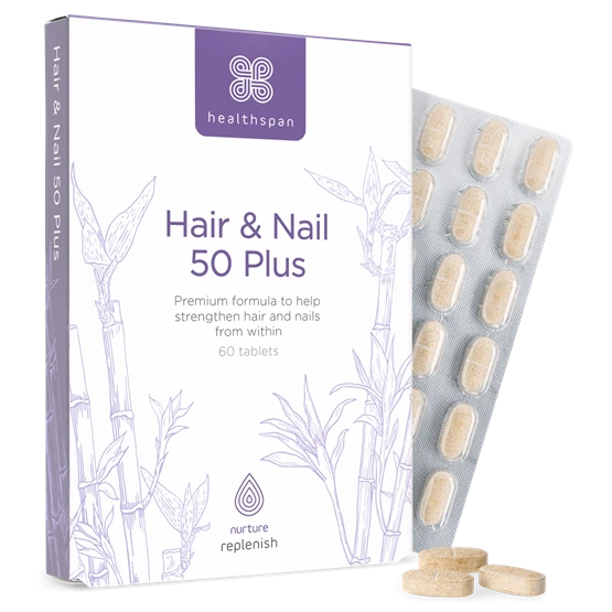A premium hair and nail strengthening supplement specially formulated to support women during and after the menopause. During the menopause, levels of the hormone oestrogen decrease, which leads to many of the unwanted symptoms such as thinning hair and brittle nails. In one convenient daily tablet, Hair & Nail 50 Plus contains a combination of innovative natural ingredients and proven micronutrients to help promote glossy, shiny hair and strong, healthy−looking nails. The perfect way to replenish beauty from within.