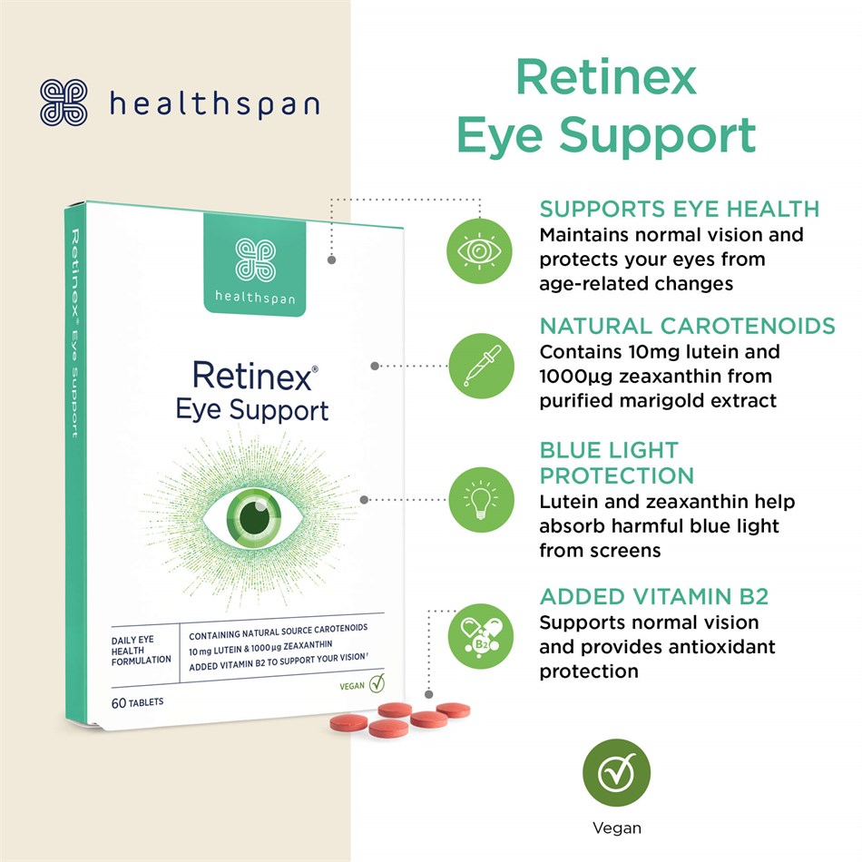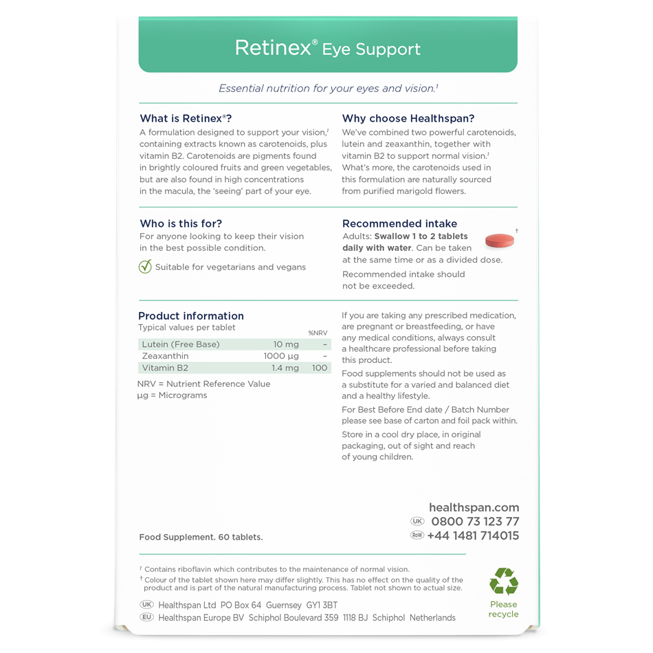 It's a vegan formulation that's specially designed to support your vision and eye health. While extended lifespans are certainly something to celebrate, they also mean that age−related sight problems are on the rise, so it's important to give your precious peepers plenty of support. Retinex® contains natural lutein and zeaxanthin, two powerful carotenoids found in high concentrations in the macula, the 'seeing' part of your eye. With the increased use of computers and smartphones, it's also encouraging to know that lutein and zeaxanthin absorb blue light! We've also combined them with the full amount of vitamin B2 that the EU recommends all adults should consume daily. This powerful nutrient is proven to contribute to normal vision and to act as an antioxidant, combating the cell damage that occurs over time due to everyday environmental stresses.