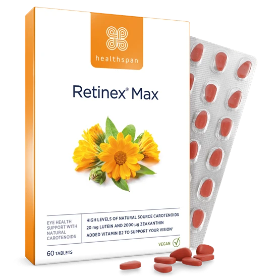 Retinex® Max is designed to offer superior support for your eye health with a carefully crafted formulation. We include Vitamin B2 (Riboflavin), which is proven to contribute to normal vision and acts as a potent antioxidant. This helps protect your eyes from oxidative stress caused by everyday environmental factors, such as exposure to pollution and UV light. In addition, our lutein and zeaxanthin are sourced naturally from marigold flowers and undergo a standardised extraction process to ensure consistent purity and potency. Each vegan tablet contains 20 mg of lutein and 2,000 µg of zeaxanthin, which are ideal amounts for supporting healthy vision and protecting your eyes from harmful blue light. This thoughtful combination ensures that Retinex® Max delivers the best possible protection and nourishment for your eyes, making it a superior choice for maintaining your vision.