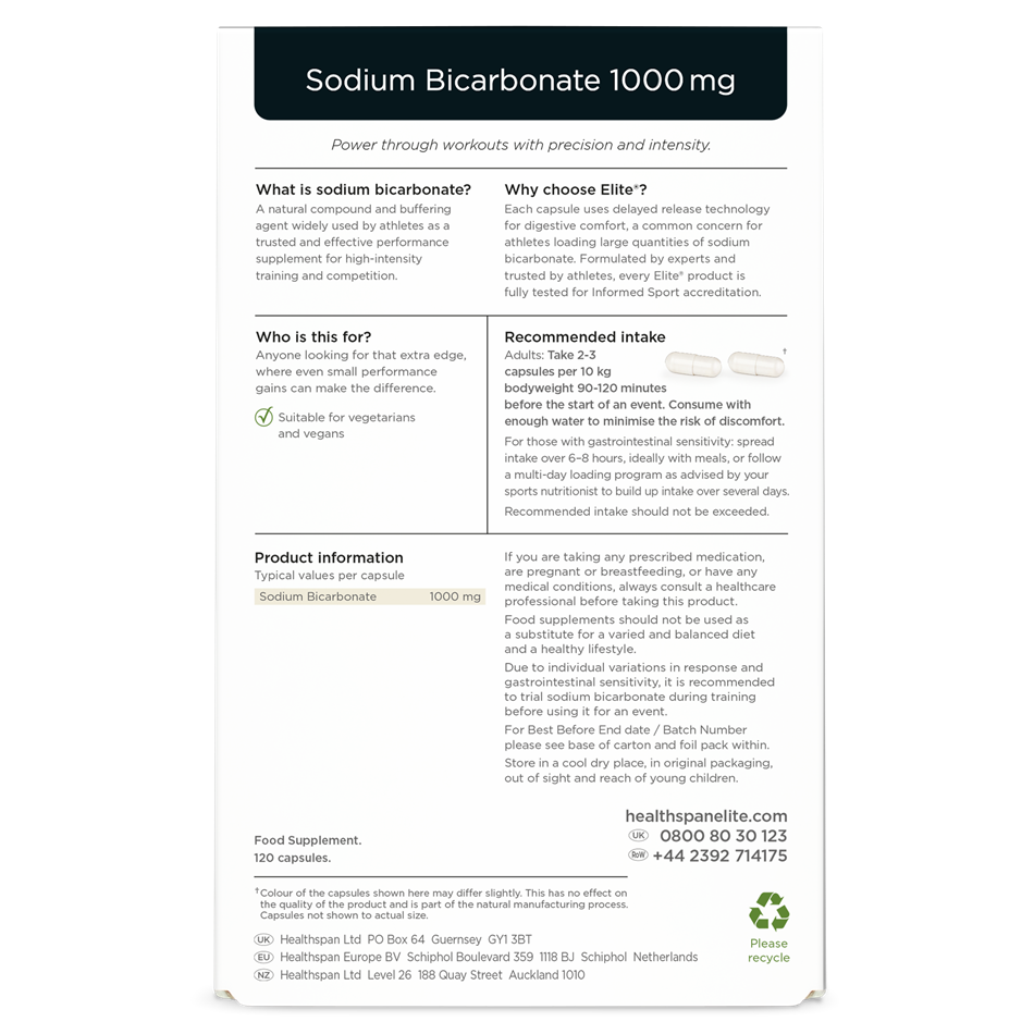 This is the UK’s first Informed Sport approved sodium bicarbonate capsule, with an impressive 1000 mg dose per one. We’ve used a delayed-release, enteric-coated capsule designed to pass through the stomach and dissolve in the lower digestive tract for minimal discomfort and optimal uptake. Because sodium bicarbonate is primarily absorbed in the small intestine, this targeted delivery significantly enhances its effectiveness. Each capsule provides a high-strength 1000 mg dose, making it easier to calculate your ideal intake while reducing the number of capsules needed. Formulated by experts and trusted by athletes, every Elite® product is fully tested for Informed Sport accreditation.