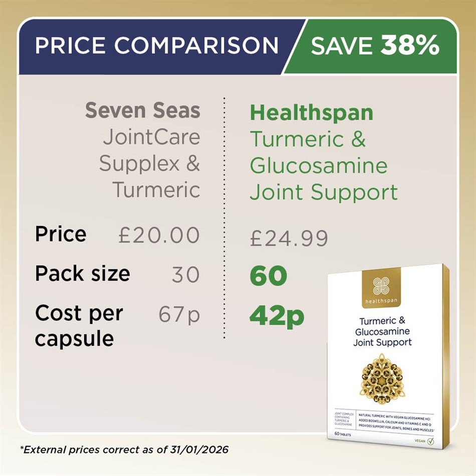 A unique and exclusive formulation combining innovative ingredients with the very best nutrients to keep your joints and bones healthy.* Known as the 'golden spice of India', Turmeric has been a pillar of Ayurvedic culture for centuries. And Glucosamine is found naturally in the body, specifically the connective tissues and a long−standing favourite with Healthspan customers. But that's not all − we've also added boswellia serrata, which is extracted from the gum resin of the Boswellia tree.
