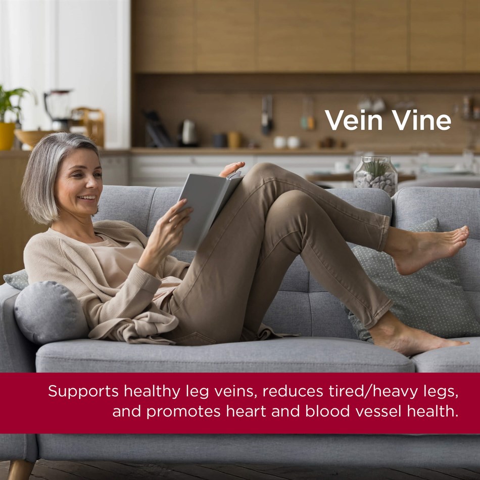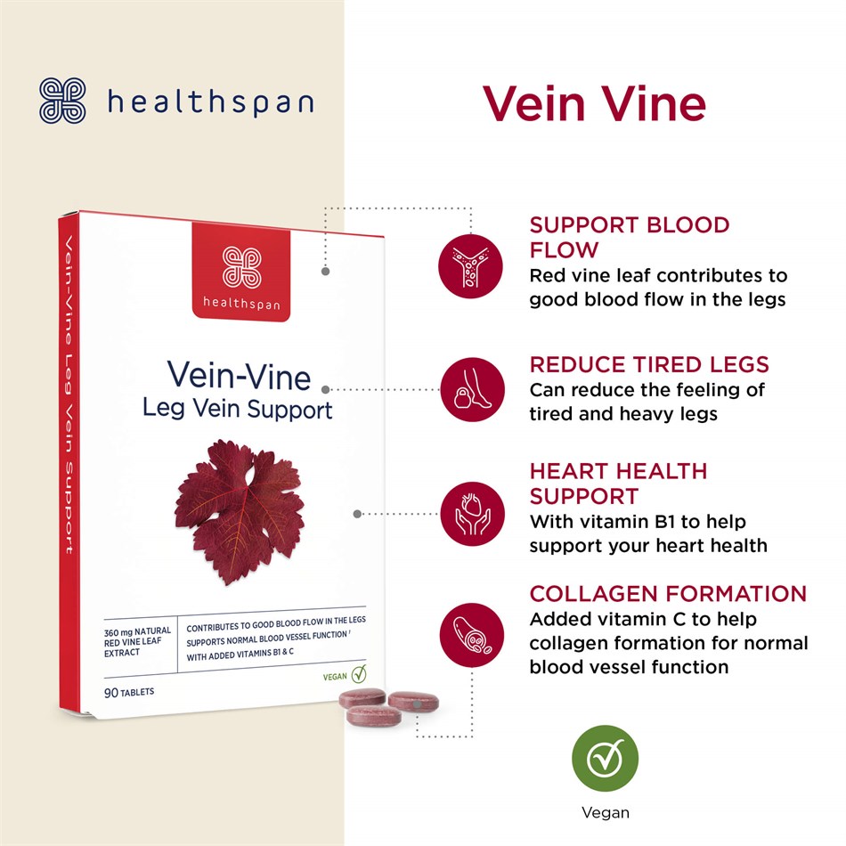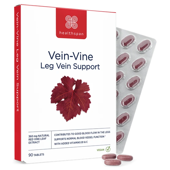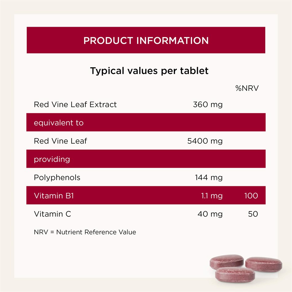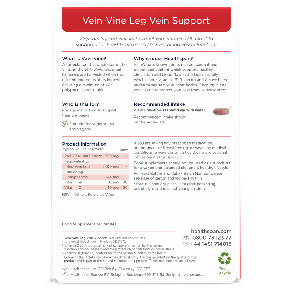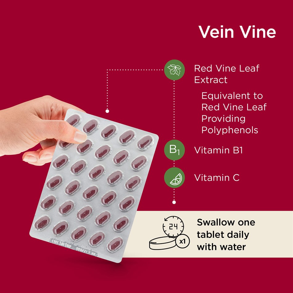 Our new and improved Vein-Vine formulation now contains vitamins B1 and C, to support your heart health and blood vessels, while remaining at the same price as before. Our red vine leaves are harvested when its nutrient content is at its highest; the leaves are then dried and its nutrients extracted using precise temperature controls and purified water, guaranteeing a grapevine extract of the highest quality. Each tablet contains 360 mg of natural red vine leaf extract − equivalent to 5400 mg of fresh red vine leaf − including 40 % polyphenols, the key ingredient. Take daily for at least six weeks to start seeing the full benefits.