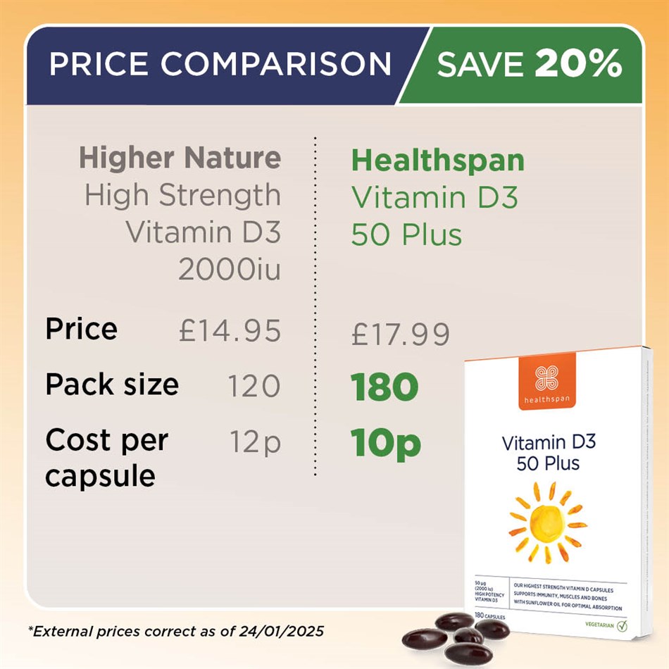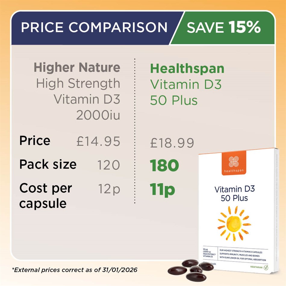 We've created a capsule with optimum levels of vitamin D3 for those over the age of 50. We use the D3 form as this is better absorbed by our bodies. Even better, we've added a drop of refined sunflower oil to further optimise absorption and made our capsules small so they are easy to swallow.