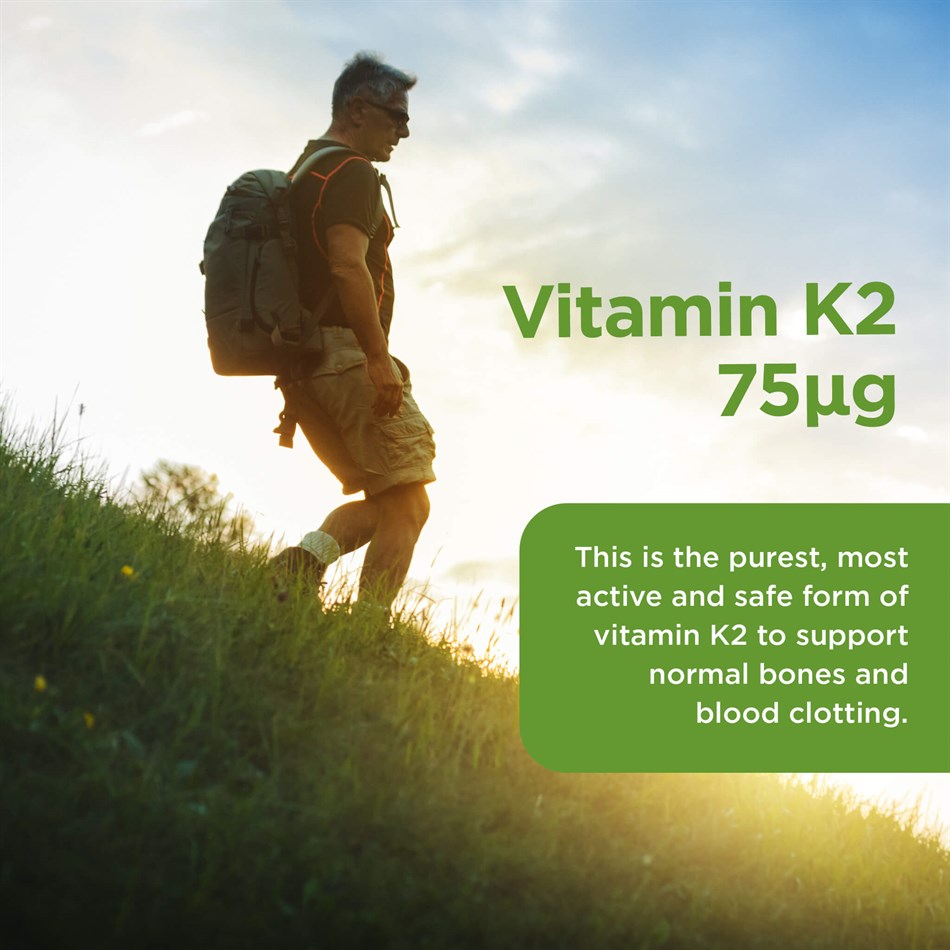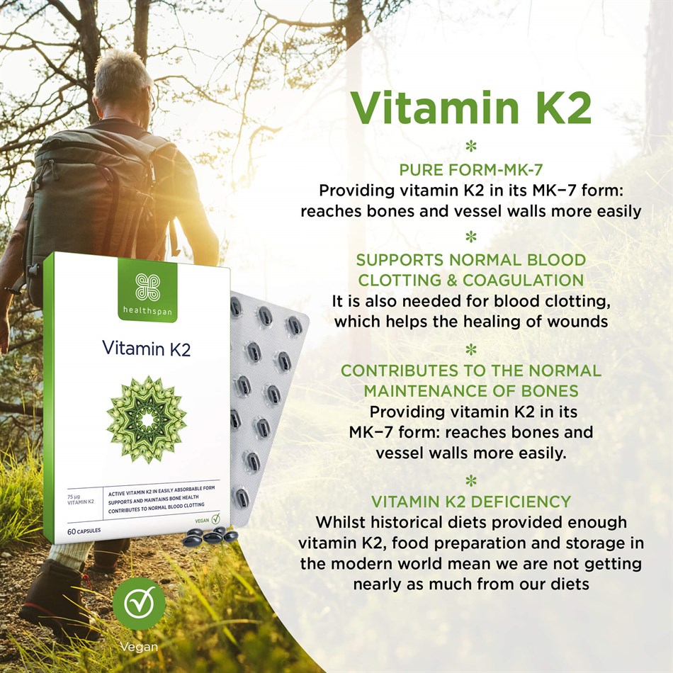 Healthspan's Vitamin K2 supplement is vegan- and vegetarian-friendly, and provides vitamin K2 in its MK-7 form, which reaches bones and blood vessel walls more easily. Vitamin K2 also has the advantage of staying in the body longer than vitamin K1.