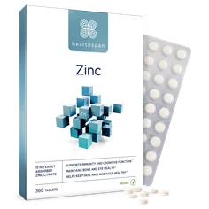 Healthspan offers three zinc supplements: Zinc with Vitamin C, Elite Zinc + Vitamin C for competing athletes, and Elite Zinc Defence Lozenges to take at the first sign of cold or flu.